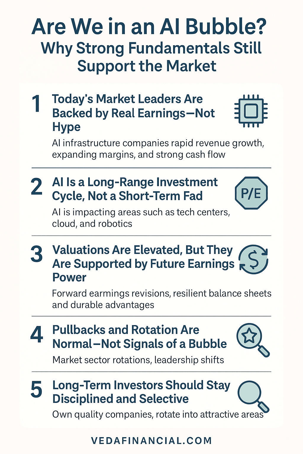 At Veda Financial, we approach these questions through a research-driven, knowledge-based methodology that optimizes value, growth, and momentum factors together. This gives us a broader and more balanced picture than looking at any single metric. And based on today’s earnings strength, investment flows, and structural demand, we do not believe we are in an AI bubble.